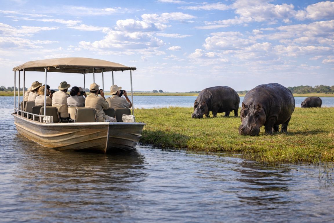 Boat Cruise/River Safari: Wildlife viewing activity along Chobe River using motorized boats carrying 10-30 passengers, lasting 2-3 hours, accessing hippos, crocodiles, elephants at river, and water birds. Unique to Chobe compared to most African parks lacking navigable rivers.